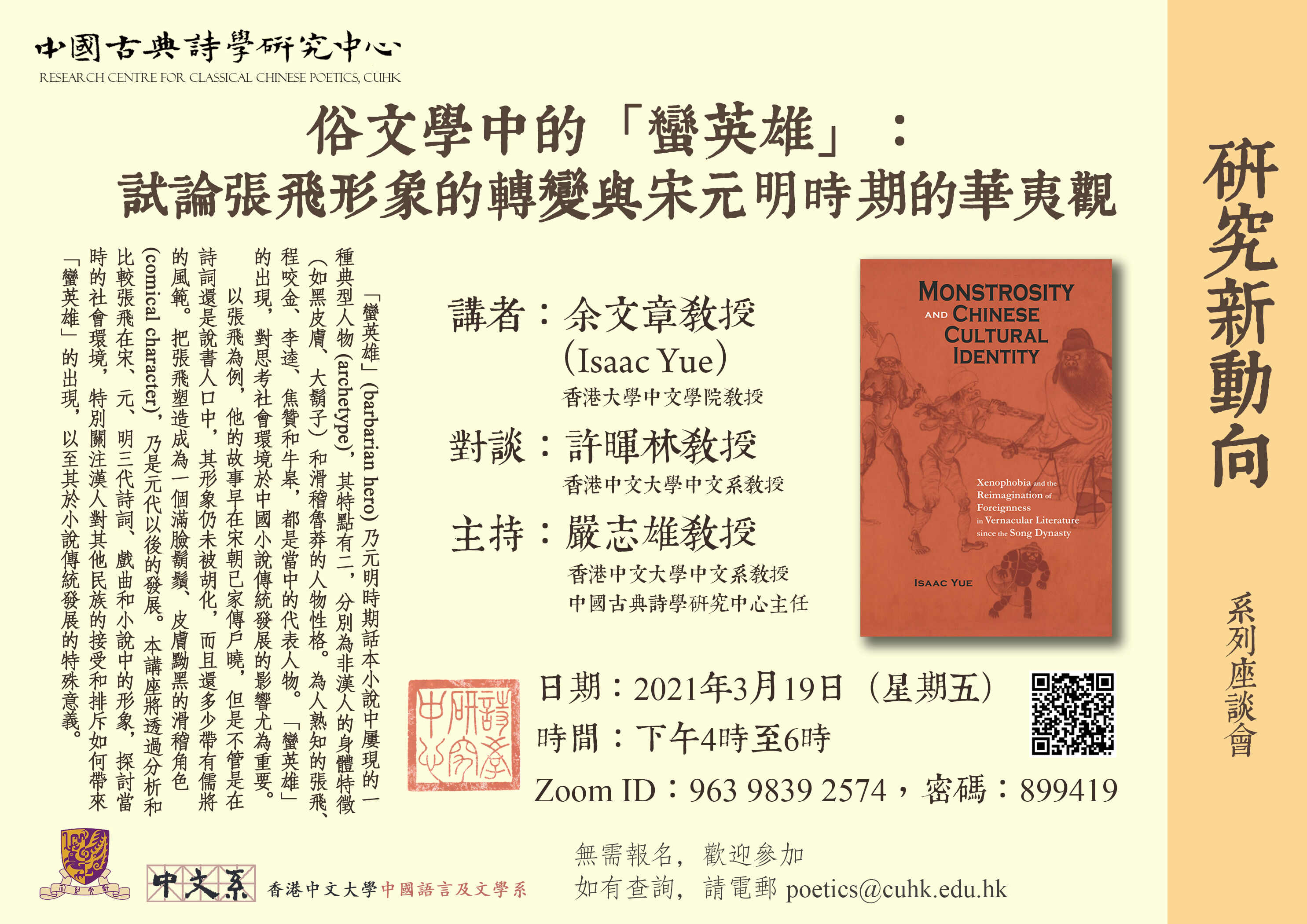 以張飛為例,他的故事早在宋朝已家傳戶曉,但是不管是在詩詞還是說書人口中,其形象仍未被胡化,而且還多少帶有儒將的風範。把張飛塑造成為一個滿臉鬍鬚、皮膚黝黑的滑稽角色 (comical character),乃是元代以後的發展。本講座將透過分析和比較張飛在宋、元、明三代詩詞、戲曲和小說中的形象,探討當時的社會環境,特別關注漢人對其他民族的接受和排斥如何帶來「蠻英雄」的出現,以至其於小說傳統發展的特殊意義。