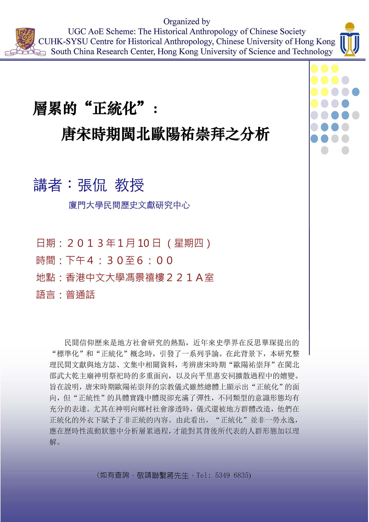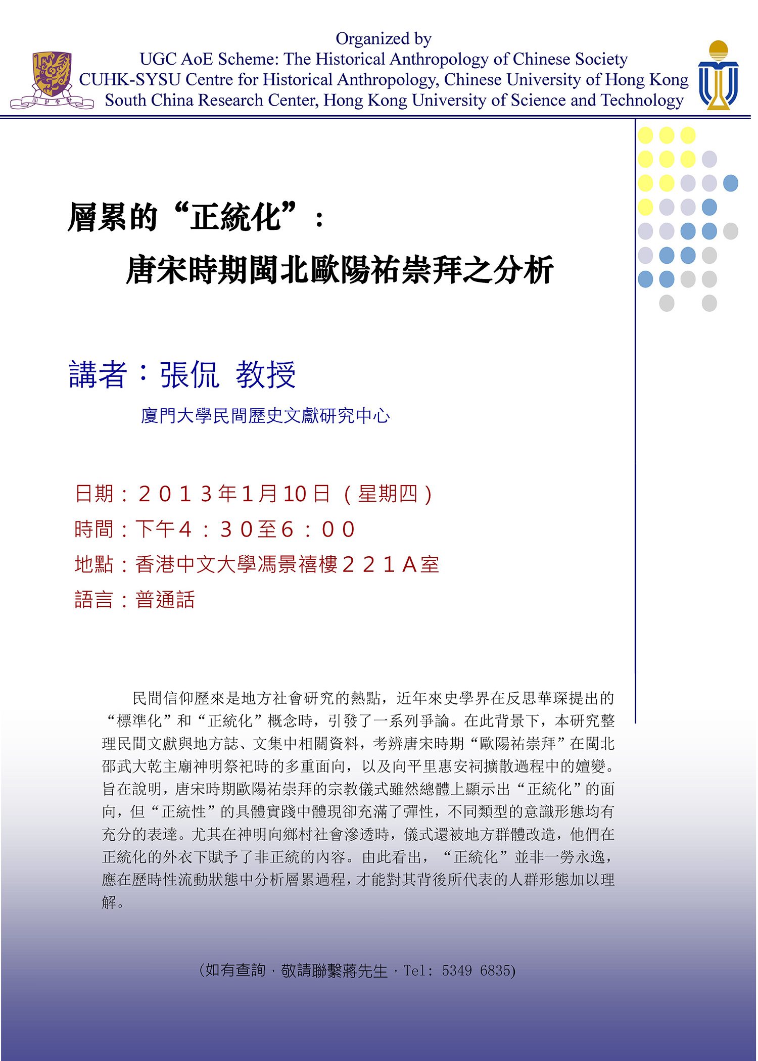 10 Jan 2013 4:30pm - 6:00pm 層累的”正統化”:唐宋時期閩北歐陽祐崇拜之分析 ZHANG Kan
