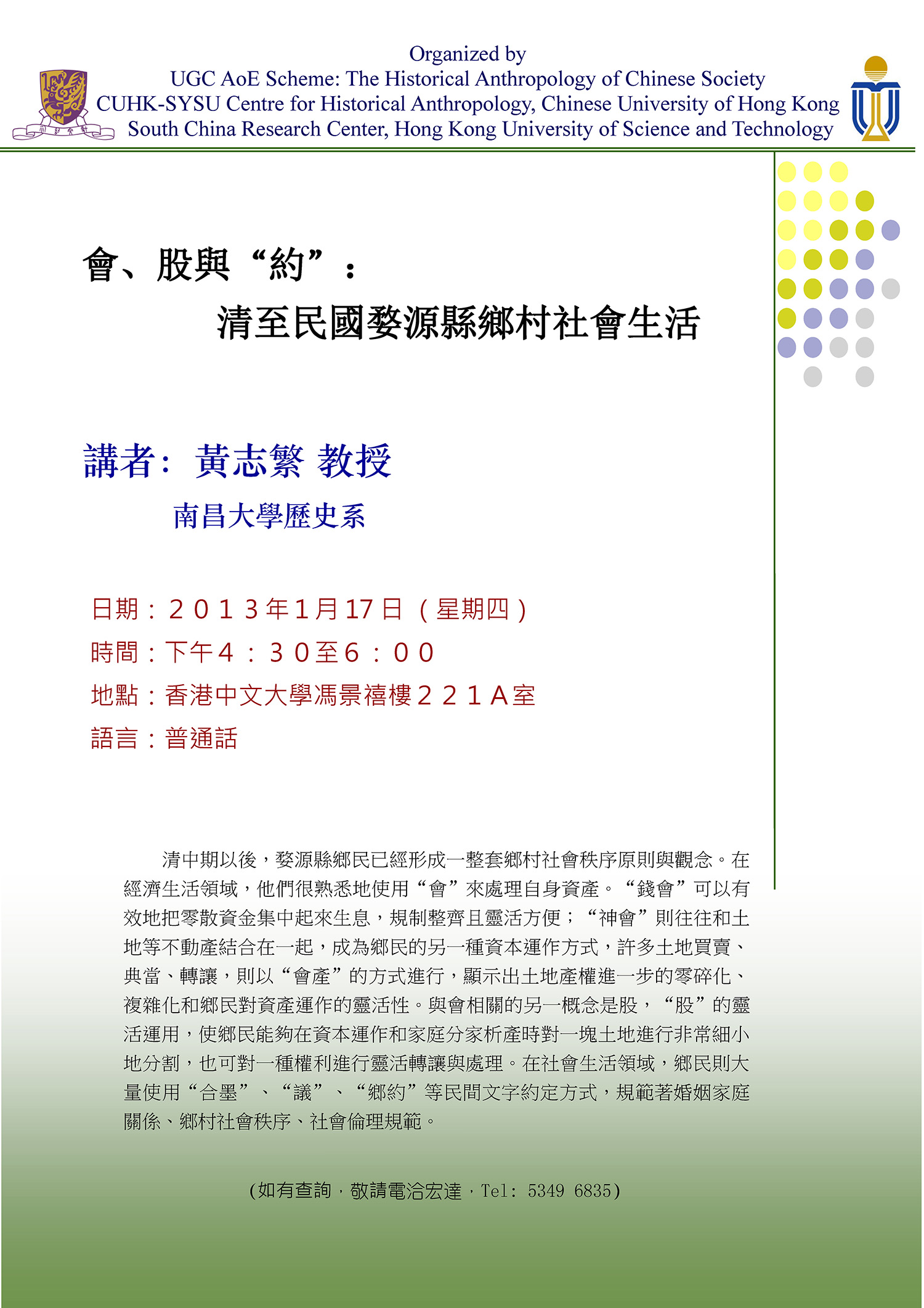 17 Jan 2013 4:30pm - 6:00pm 會、股與“約”:清至民國婺源縣鄉村社會生活 HUANG Zhifan