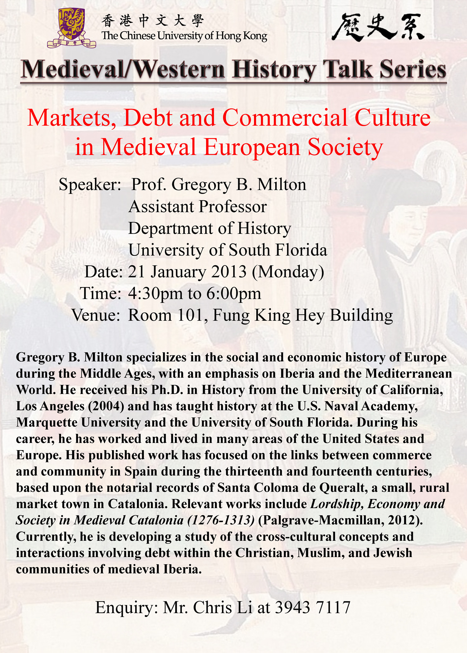 21 Jan 2013 4:30pm - 6:00pm Markets, Debt and Commercial Culture in Medieval European Society Gregory B. Milton