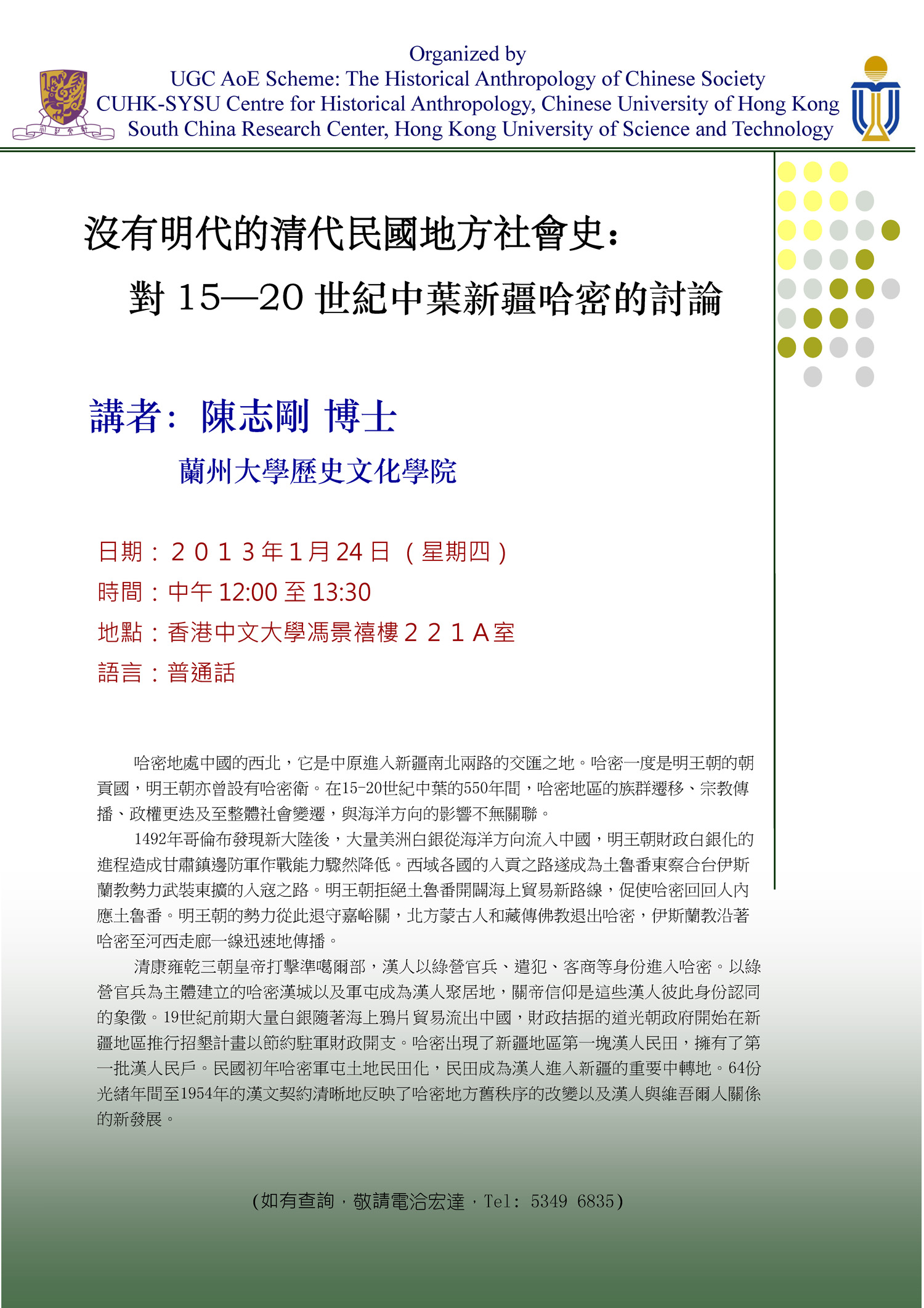 24 Jan 2013 12:00nn - 1:30pm 沒有明代的清代民國地方社會史:對15-20世紀中葉新疆哈密的討論 CHEN Zhigang