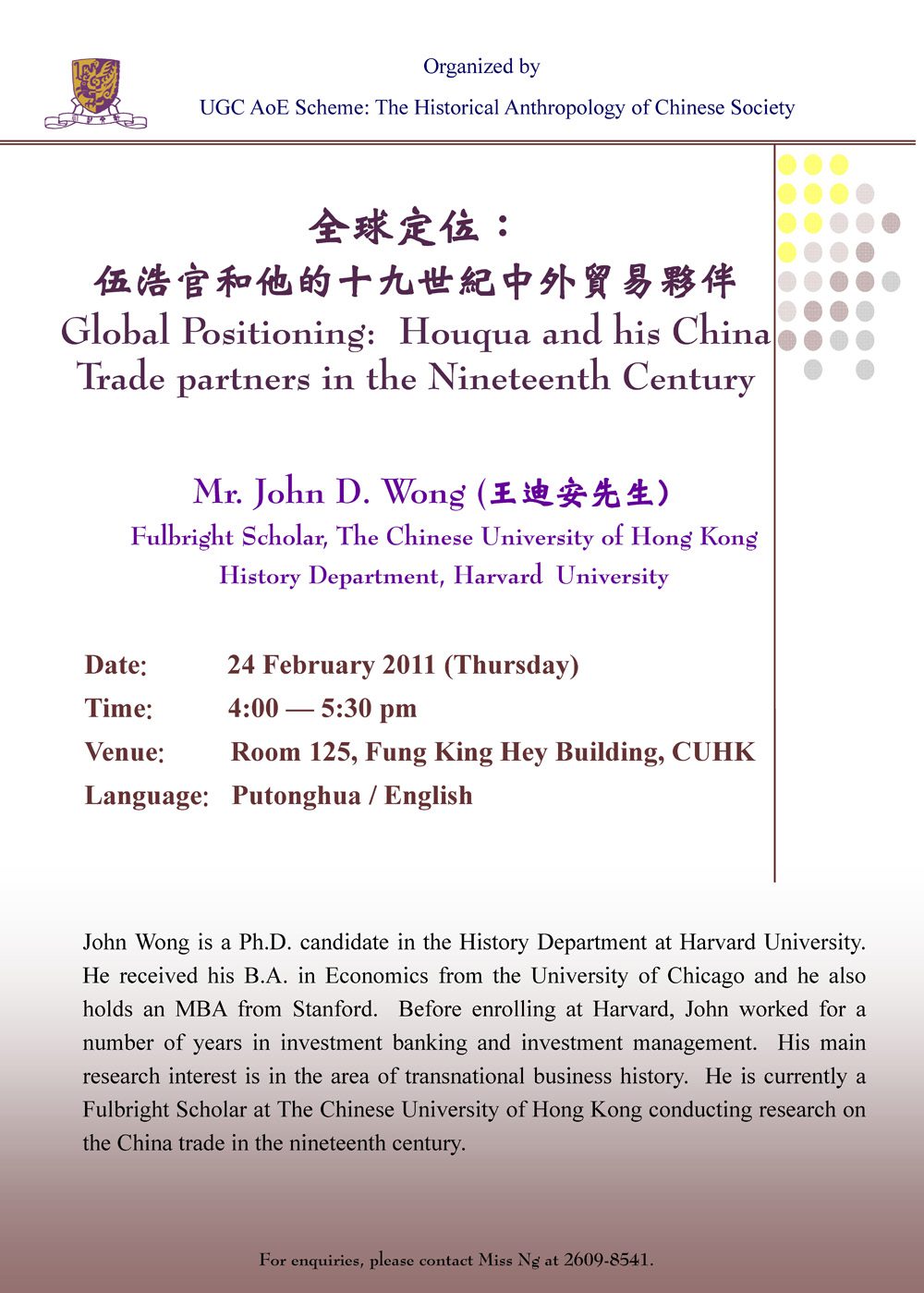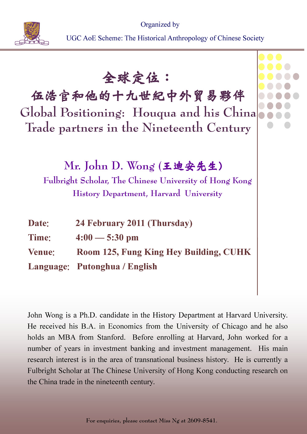 2011年2月24日 4:00pm - 5:30pm 全球定位:伍浩官和他的十九世紀中外貿易夥伴 王迪安先生