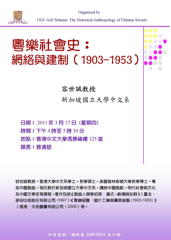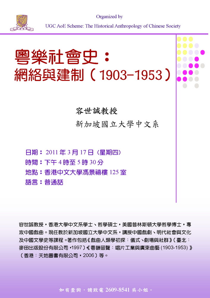 2011年3月17日 4:00pm - 5:30pm 粵樂社會史:網絡與建制(1903-1953) 容世誠