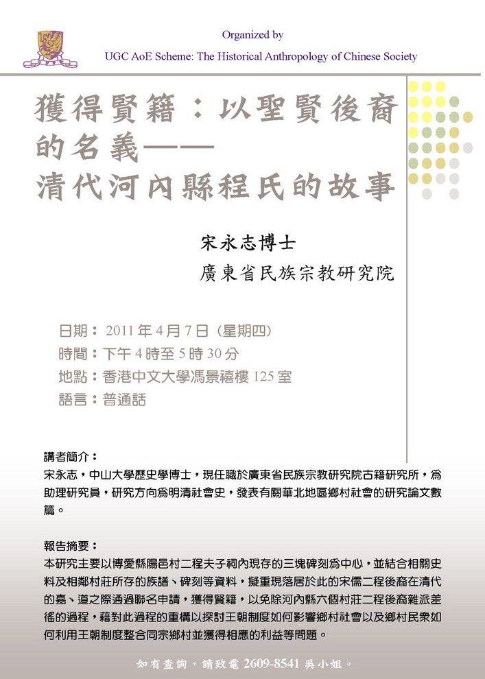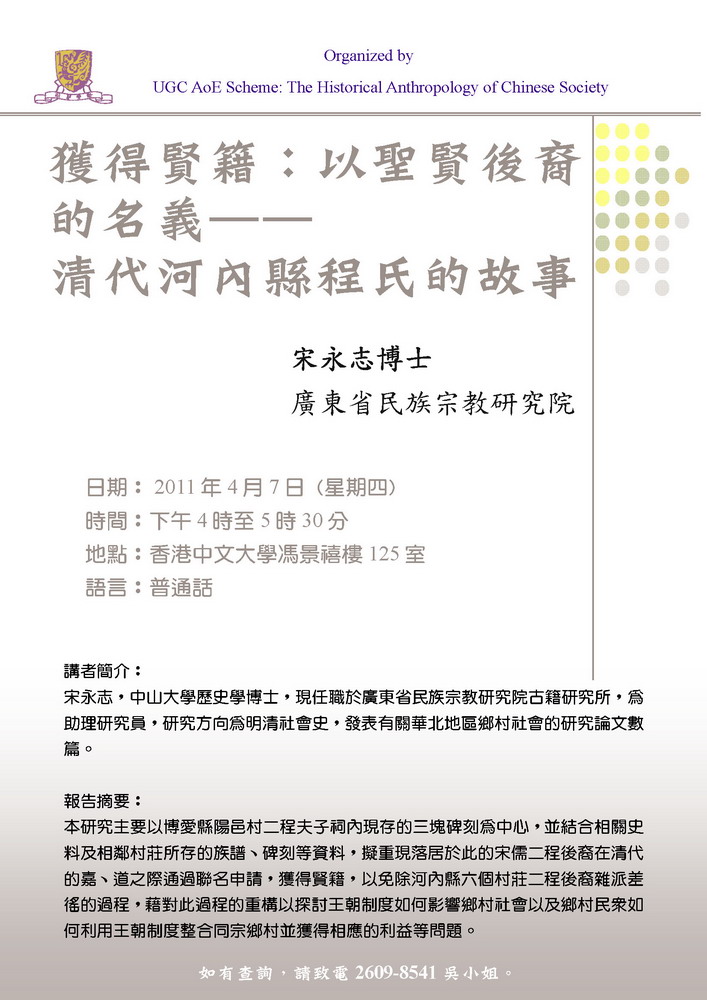 2011年4月7日 4:00pm - 5:30pm 獲得賢籍:以聖賢後裔的名義--清代河內縣程氏的故事 宋永志