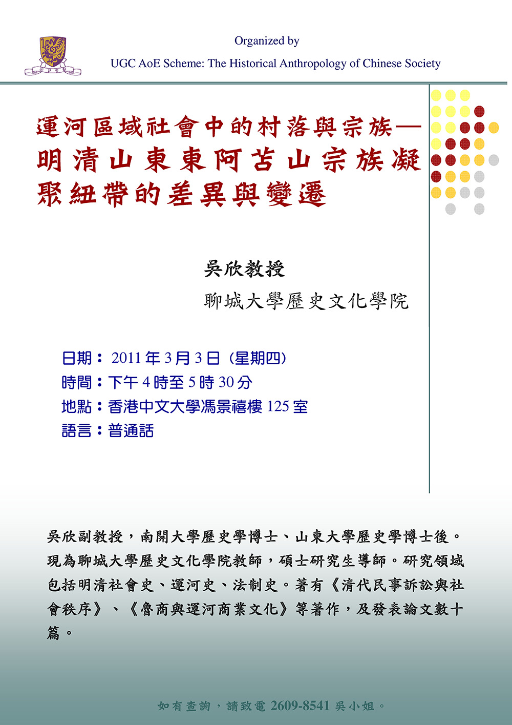 2011年3月3日 4:00pm - 5:30pm 運河區域社會中的村落與宗族—明清山東東阿苫山宗族凝聚紐帶的差異與變遷 吳欣