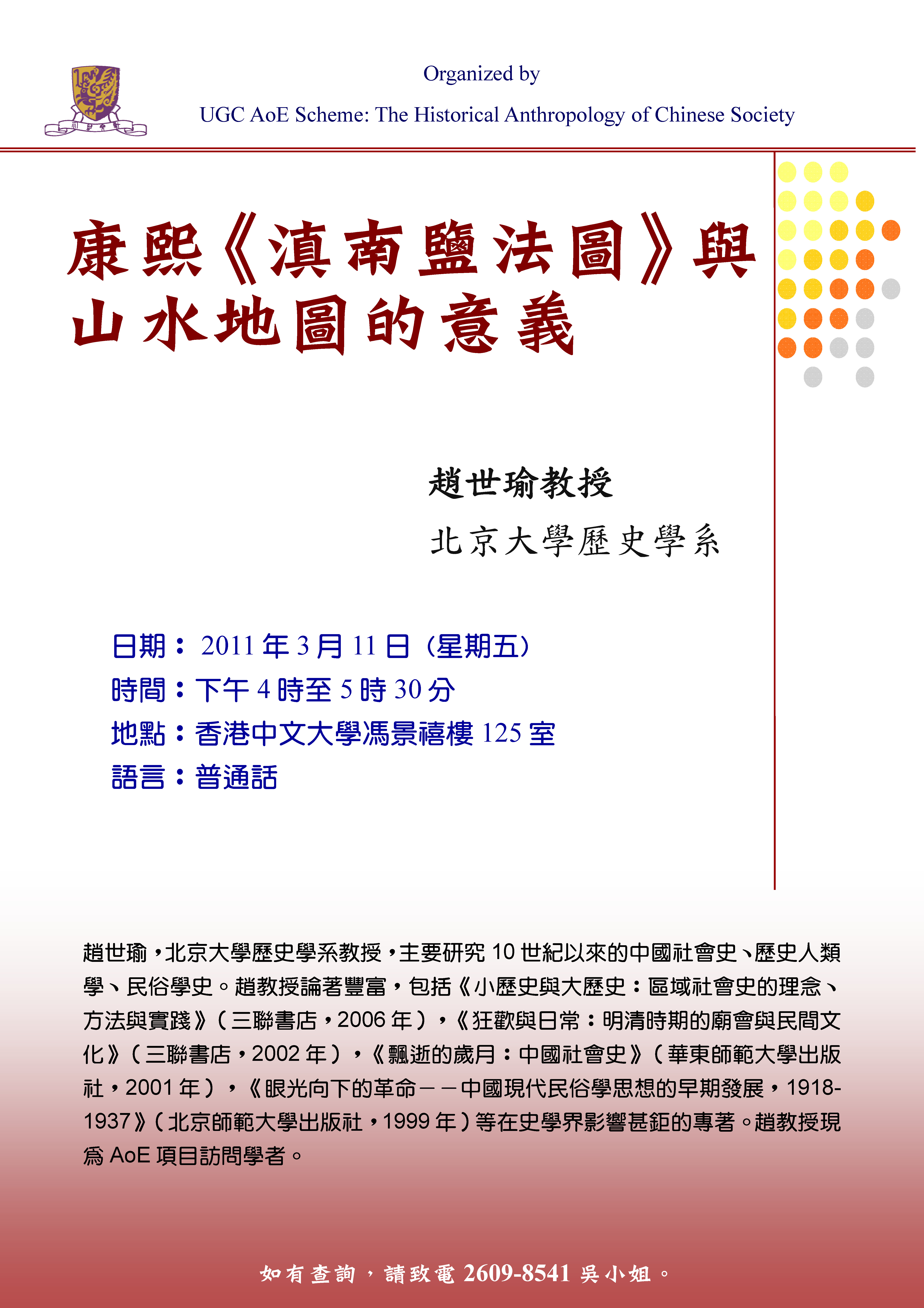 2011年3月11日 4:00pm - 5:30pm 康熙《滇南鹽法圖》與山水地圖的意義 趙世瑜
