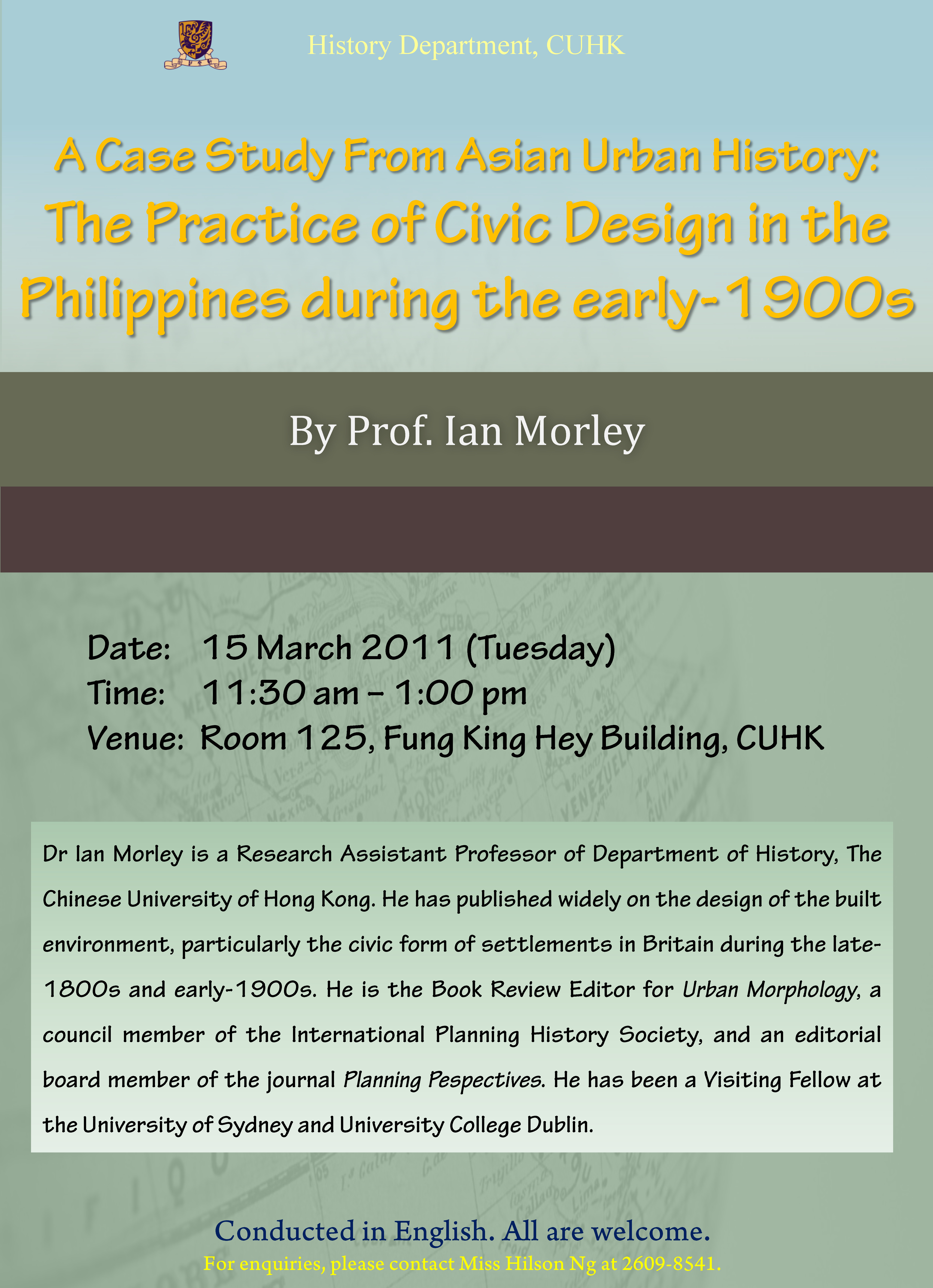 2011年3月15日 11:30am - 1:00pm A Case Study From Asian Urban History: The Practice of Civic Design in the Philippines during the early-1900s Ian MORLEY