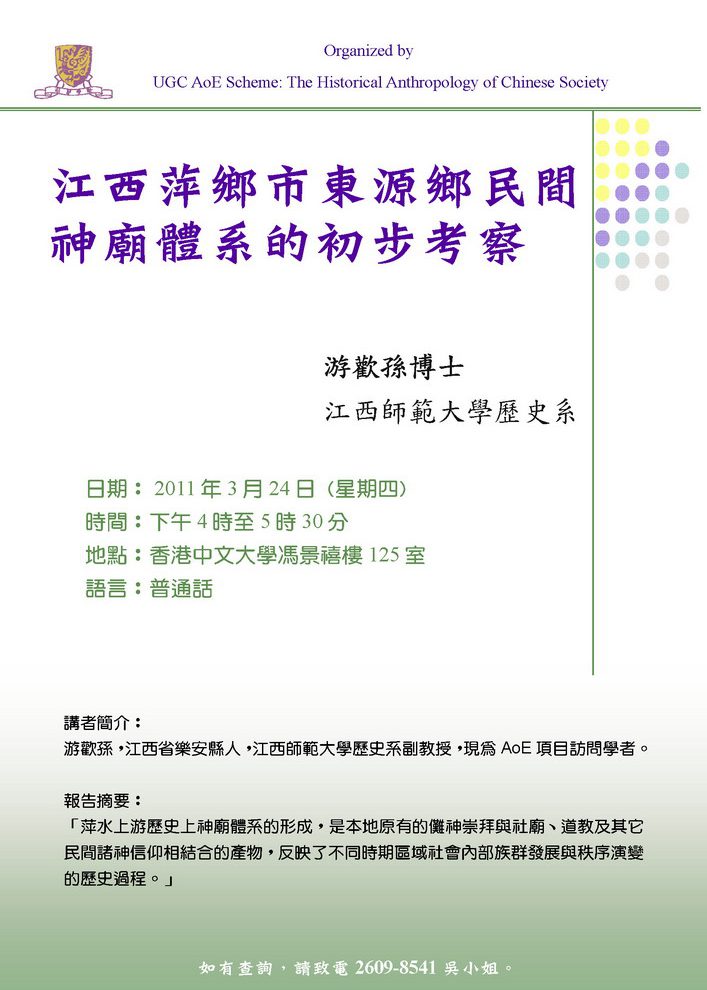 2011年3月24日 4:00pm - 5:30pm 江西萍鄉市東源鄉民間神廟體系的初步考察 游歡孫