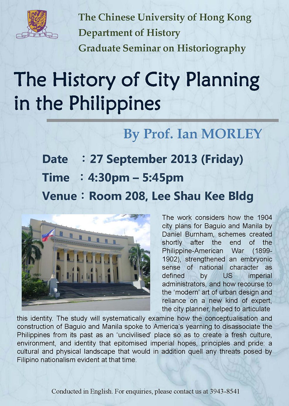 2013年9月29日 9:00am - 8:00pm 香港文化遊縱 2013年9月27日 4:30pm – 5:45pm The History of City Planning in the Philippines Ian MORLEY