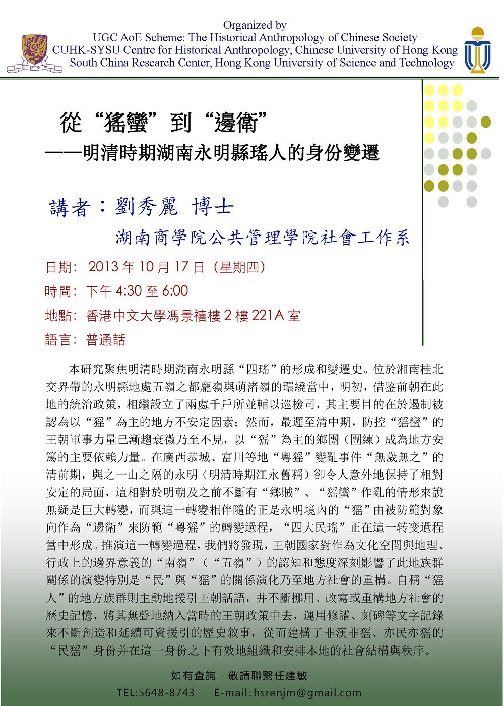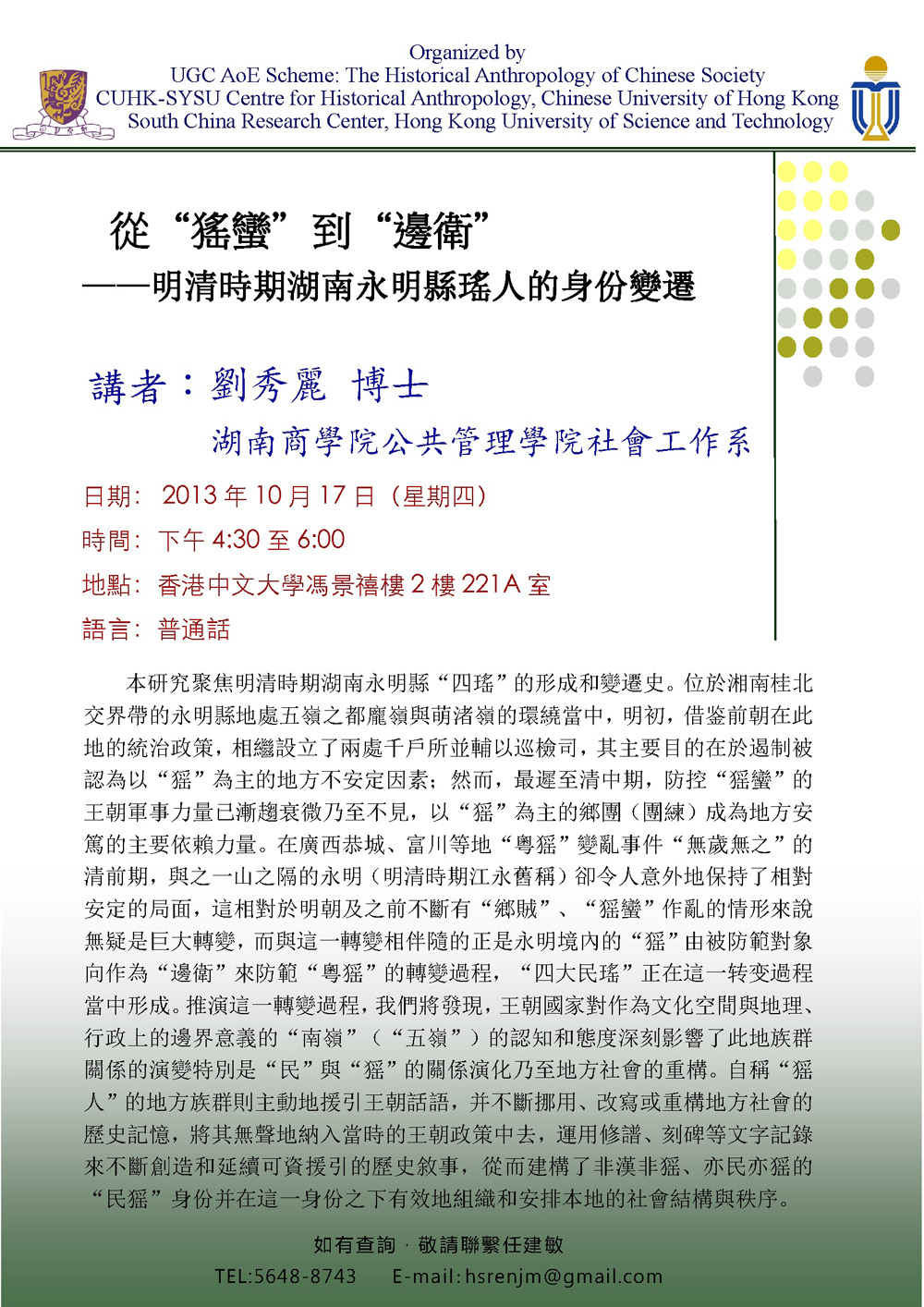 2013年10月17日 4:30pm – 6:00pm 從“猺蠻”到“邊衛”——明清時期湖南永明縣瑤人的身份變遷 劉秀麗