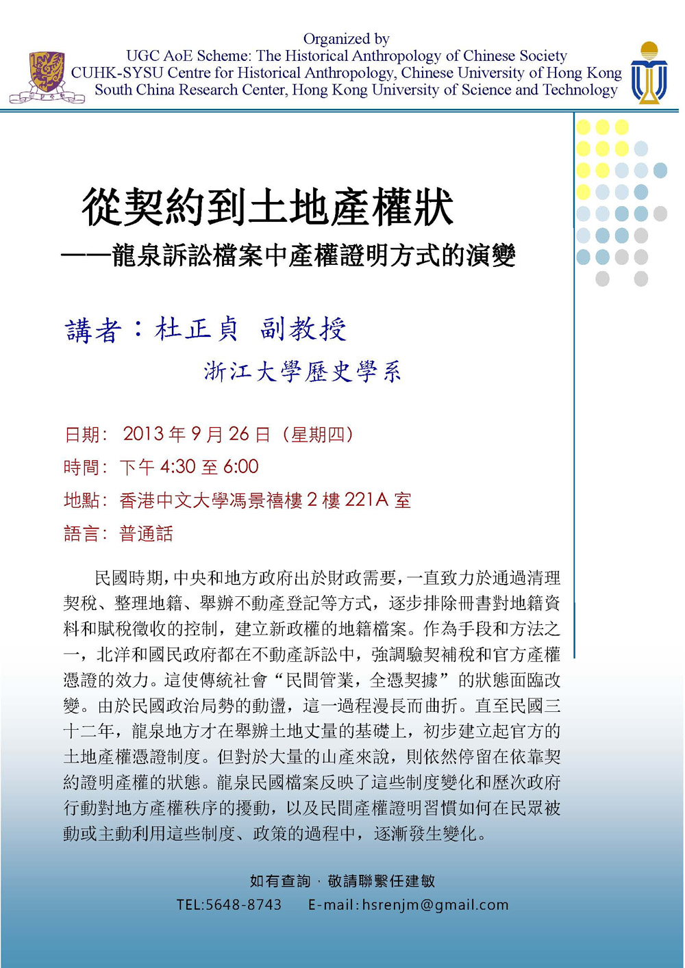 2013年9月26日 4:30pm – 6:00pm 從契約到土地產權狀——龍泉訴訟檔案中產權證明方式的演變 杜正貞