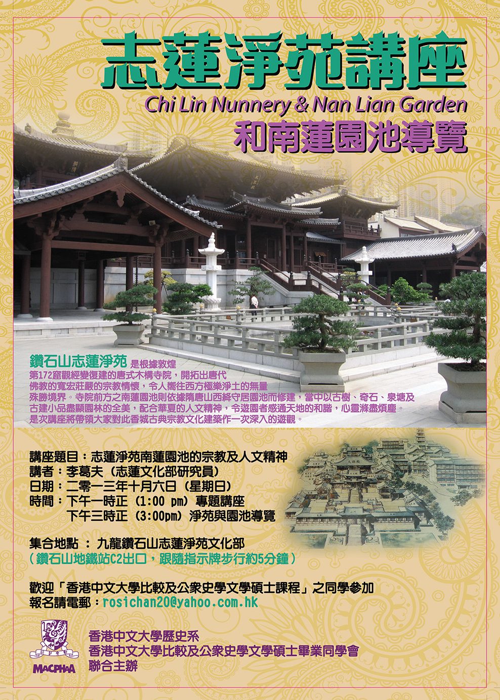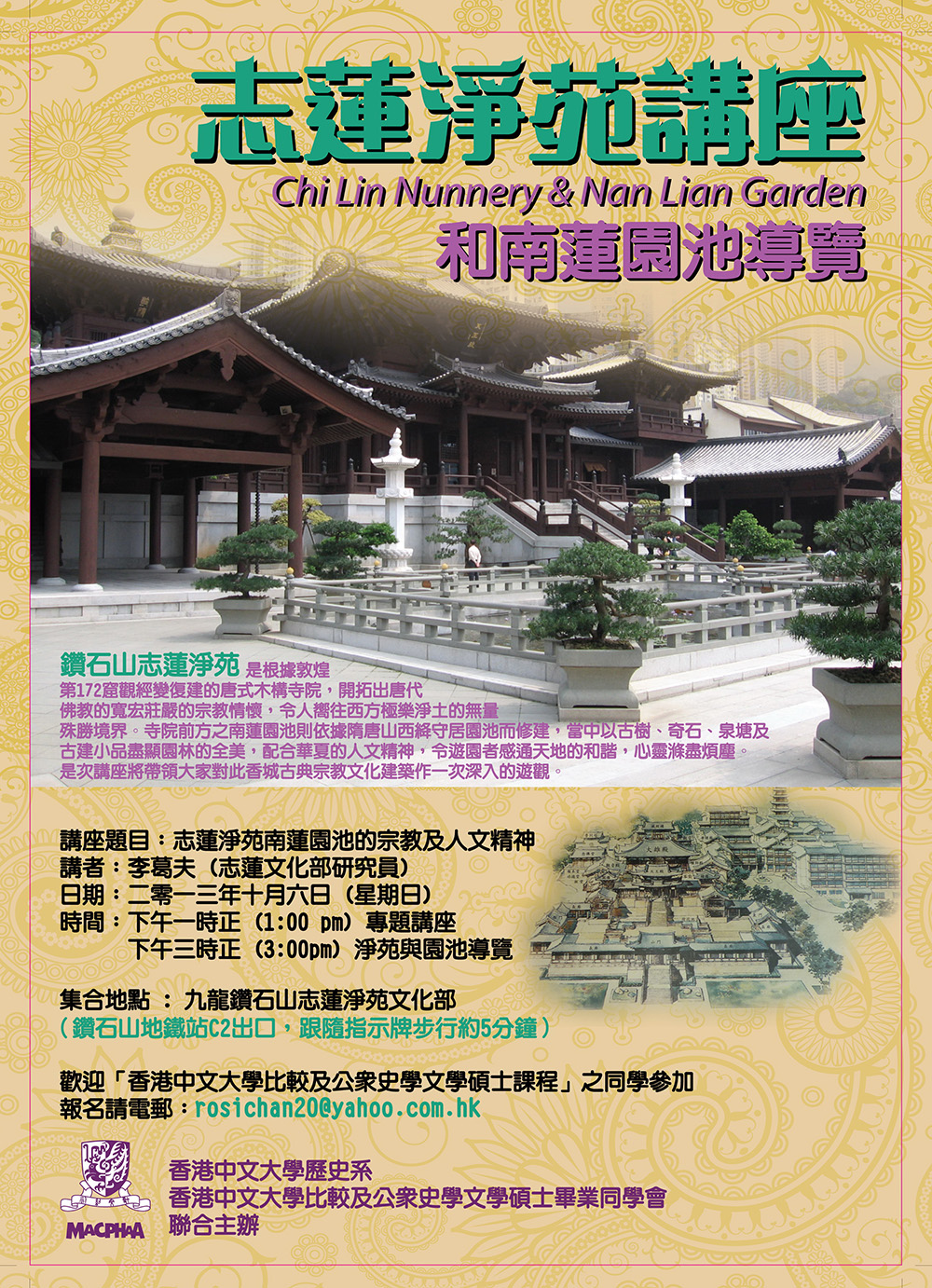 2013年10月6日 1:00pm - 3:00pm 「志蓮淨苑南蓮園池的宗教及人文精神」講座及導覧 李葛夫