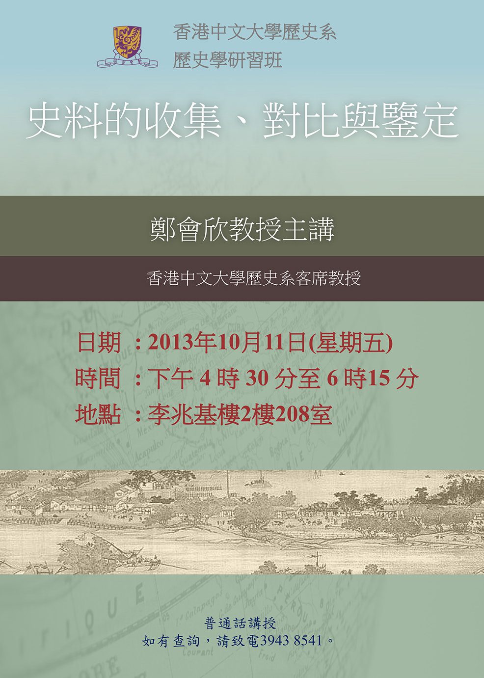 2013年10月11日 4:30pm – 6:15pm 史料的收集、對比與鑒定 鄭會欣