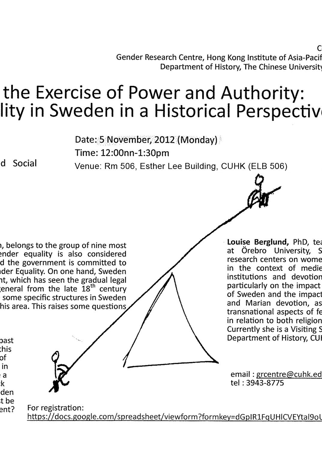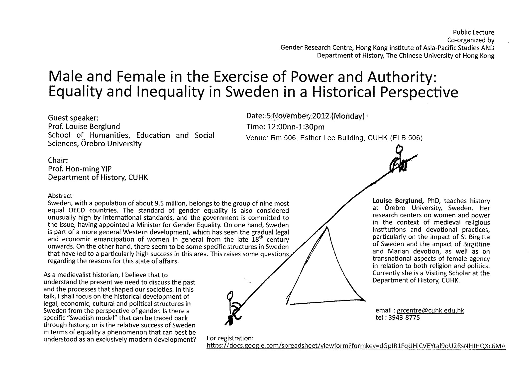 2012年11月5日 12:00nn - 1:30pm Male and Female in the Exercise of Power and Authority: Equality and Inequality in Sweden in a Historical Perspective Louise BERGLUND