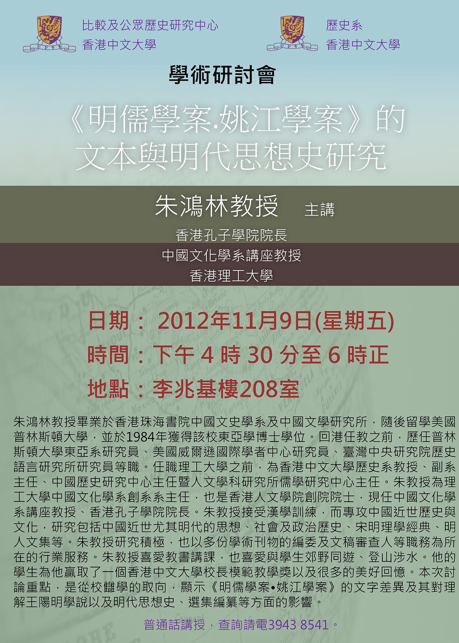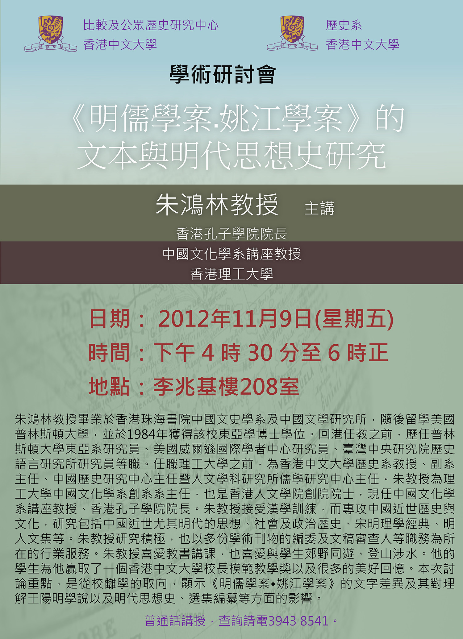 2012年11月9日 4:30pm - 6:00pm 《明儒學案•姚江學案》的文本與明代思想史研究 朱鴻林