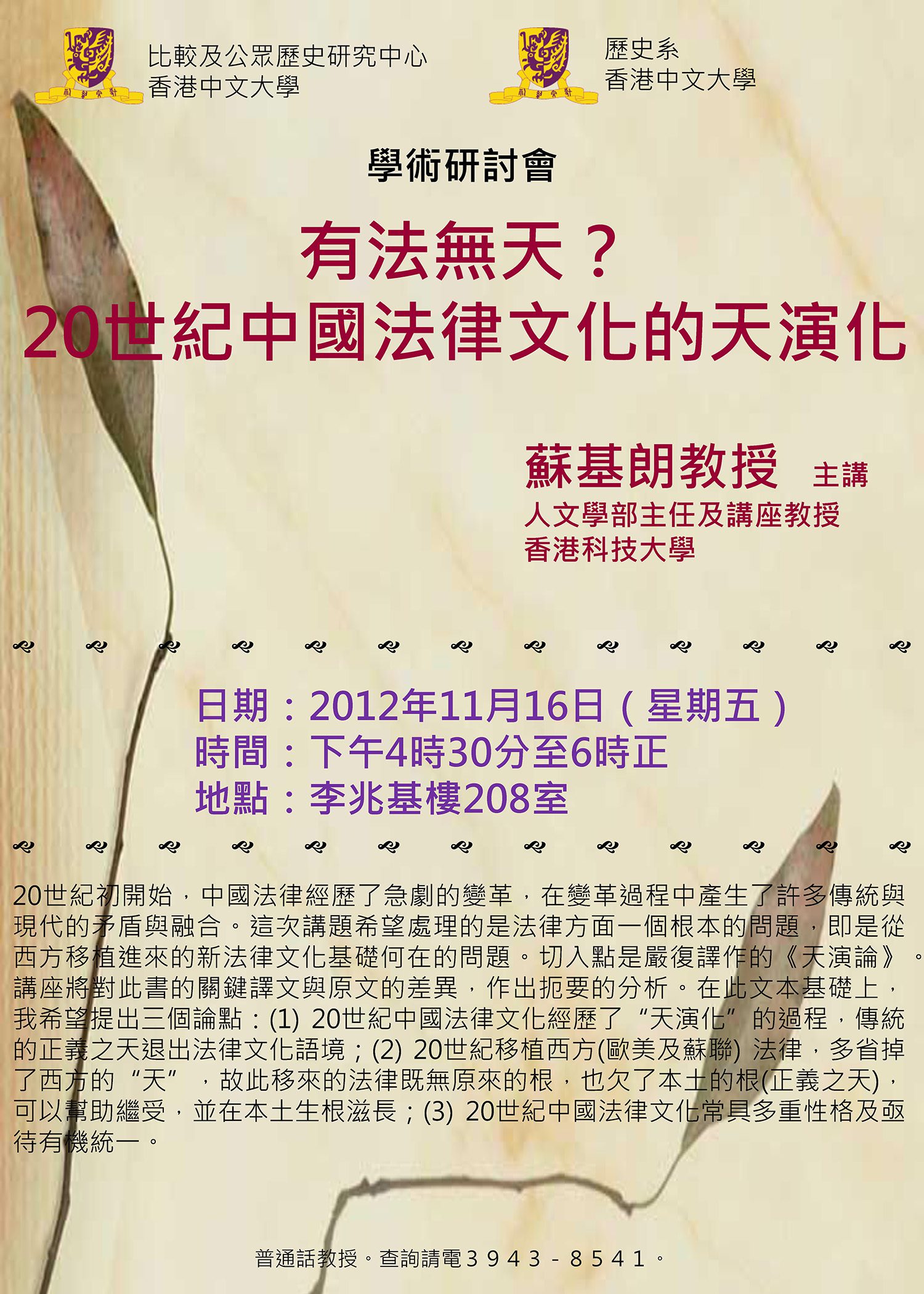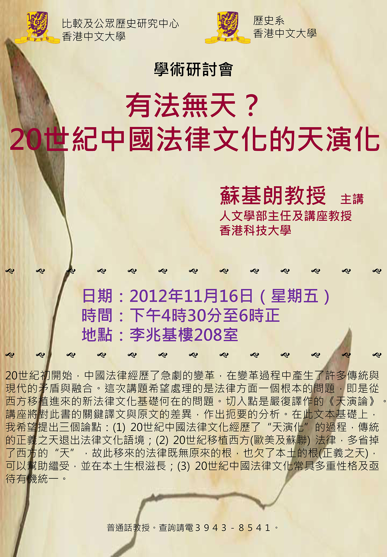 2012年11月16日 4:30pm - 6:00pm 有法無天?20世紀中國法律文化的天演化 蘇基朗