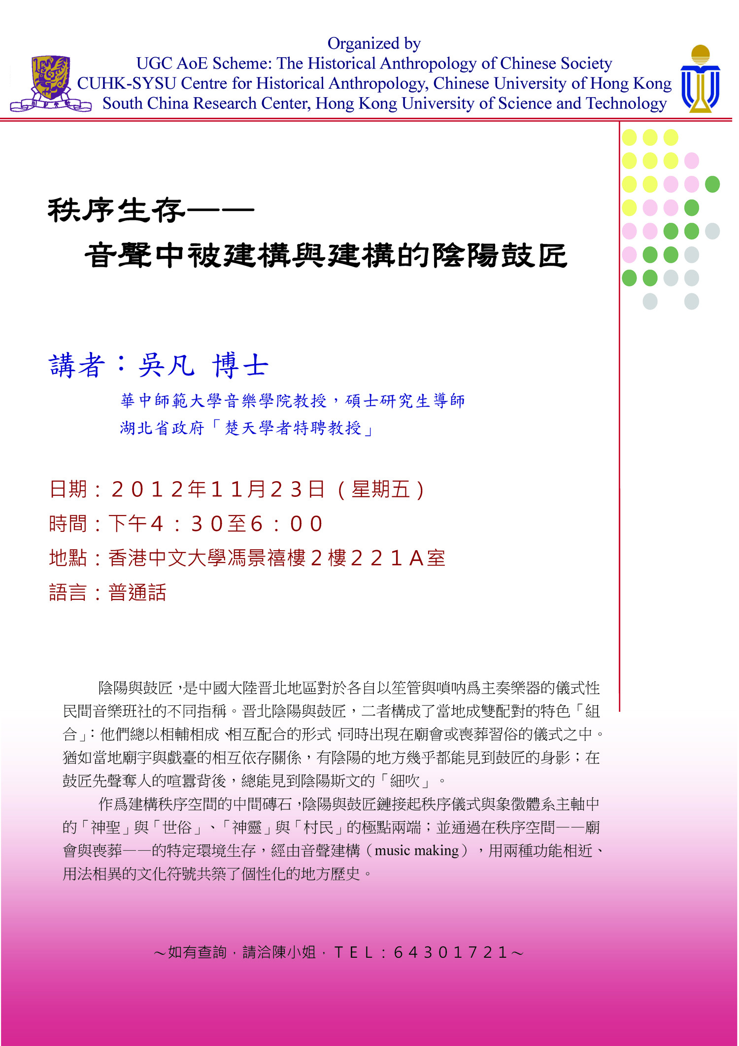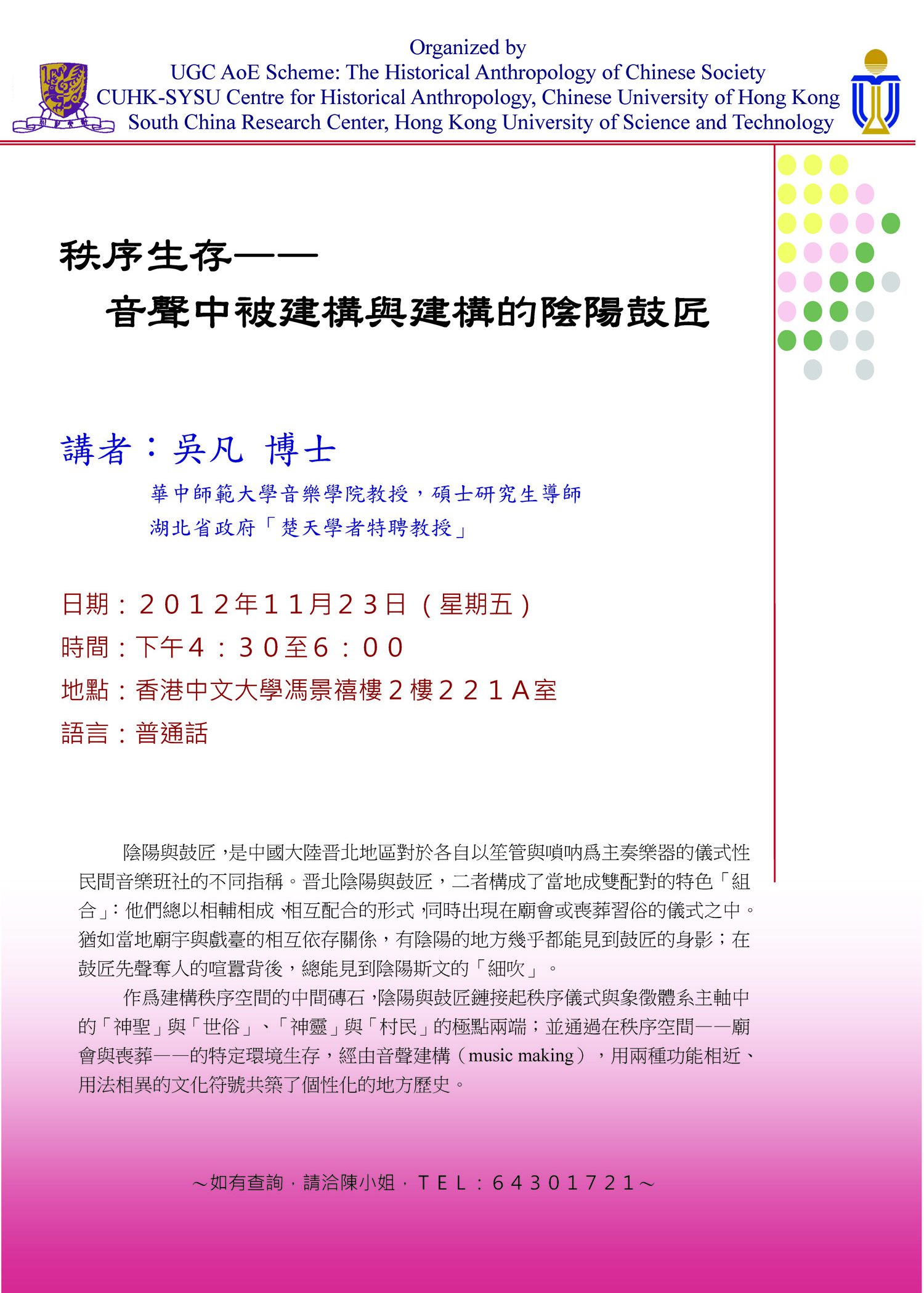2012年11月23日 4:30pm - 6:00pm 秩序生存——音聲中被建構與建構的陰陽鼓匠 吳凡博士