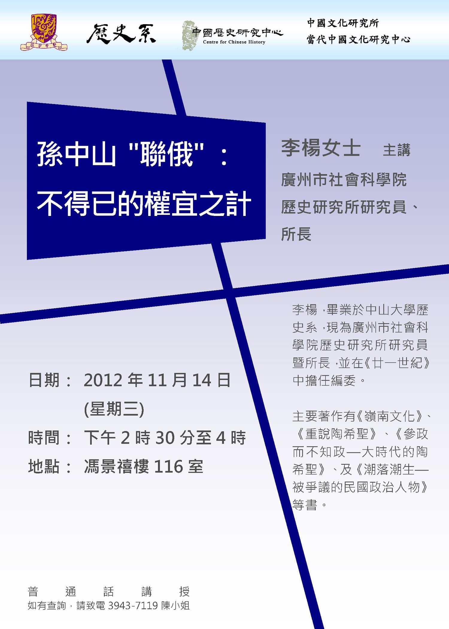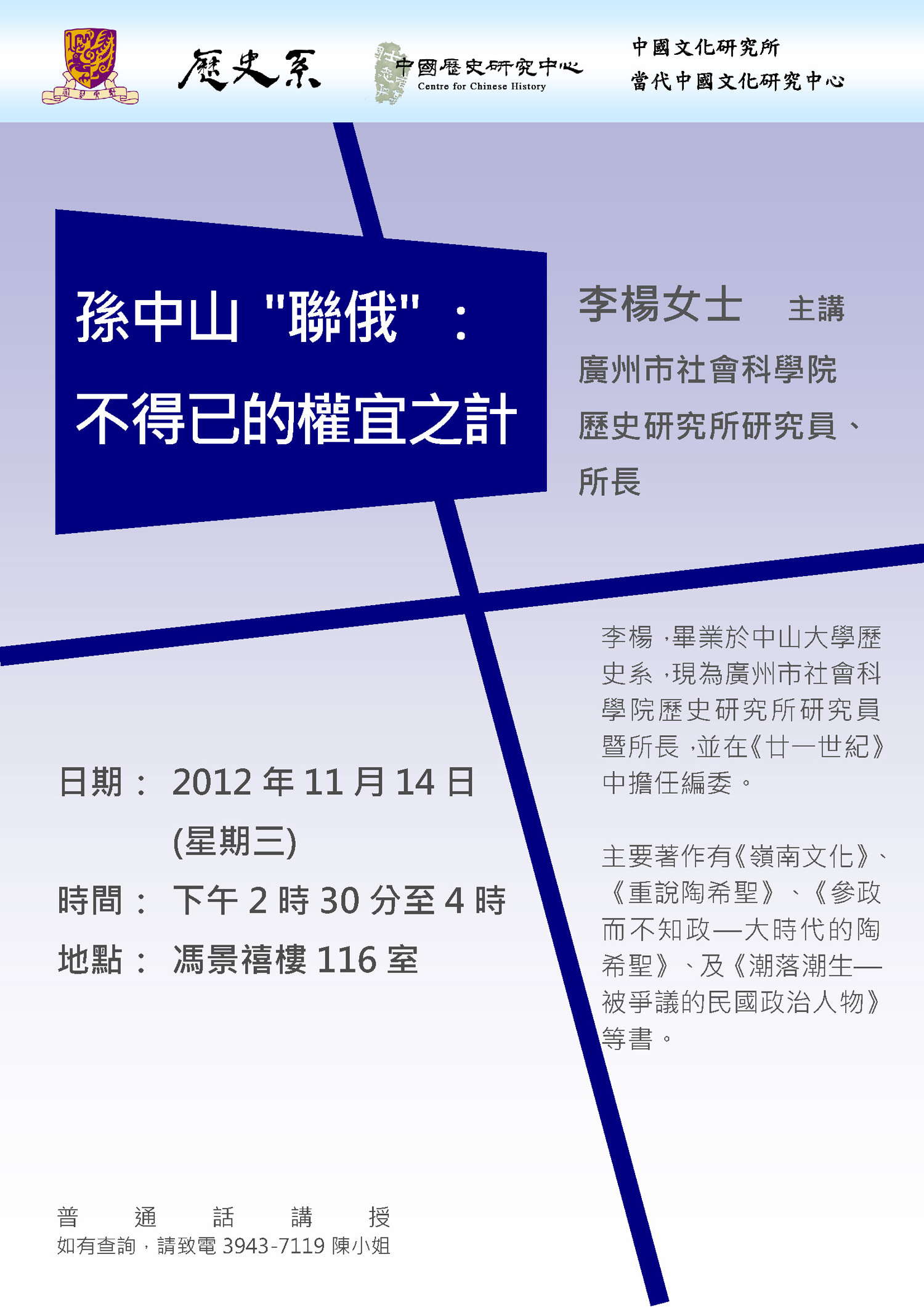 2012年11月14日 2:30pm - 4:00pm 孫中山 “聯俄” :不得已的權宜之計 李楊