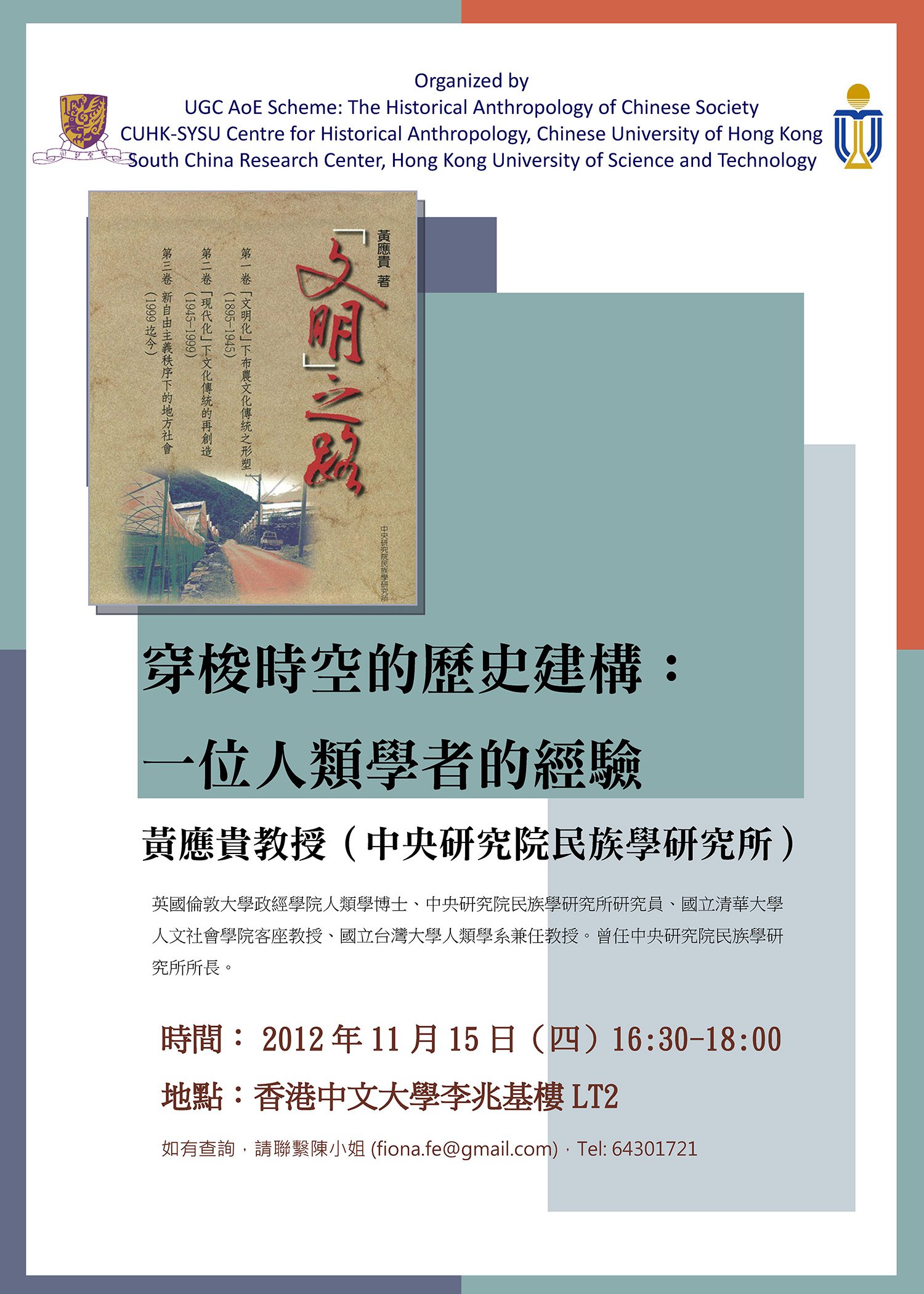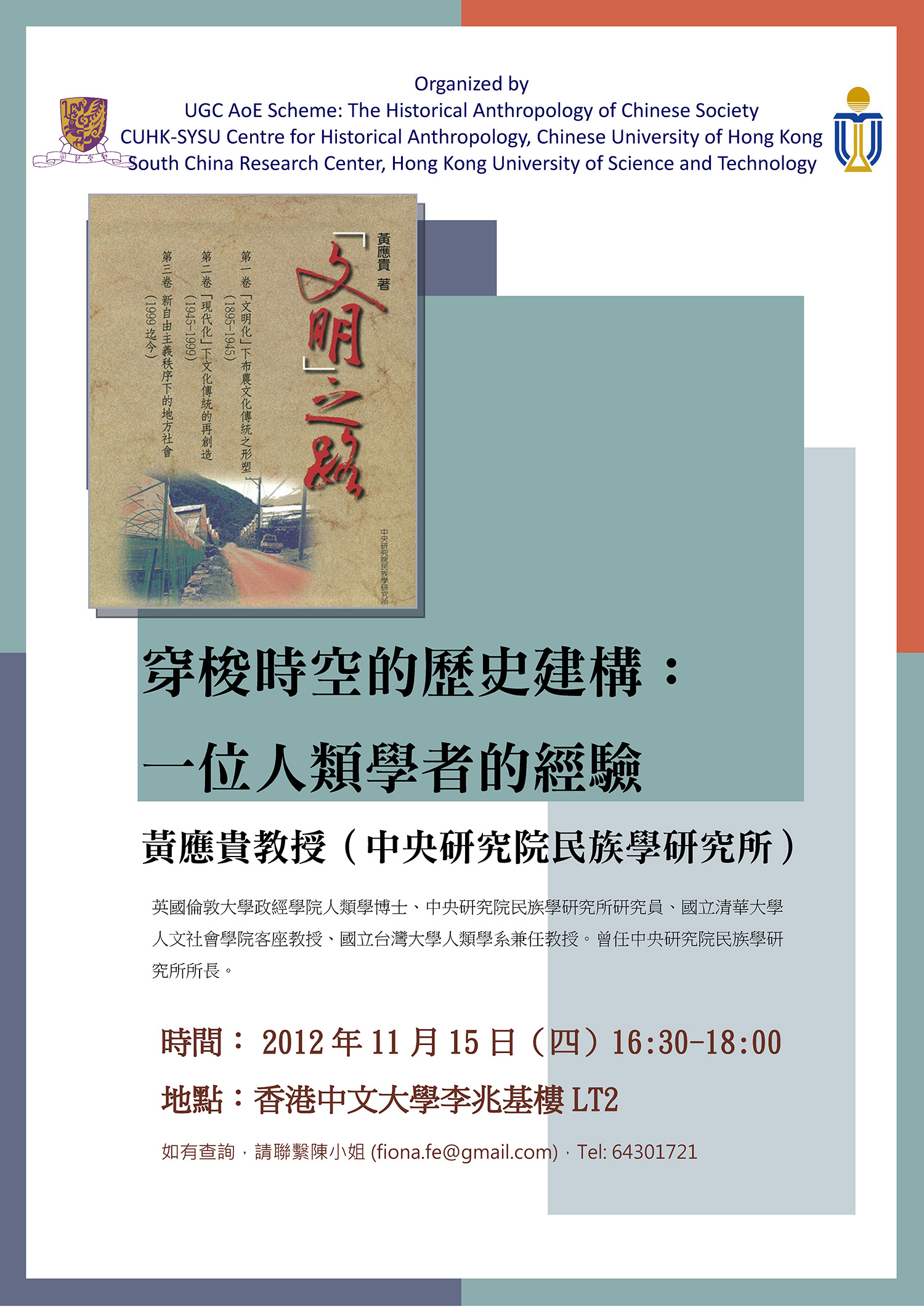 2012年11月15日 4:30pm - 6:00pm 穿梭時空的歷史建構:一位人類學者的經驗 黃應貴