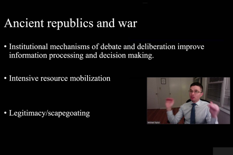 2022年10月27日,應中大比較及公眾歷史研究中心邀請,紐約州立大學奧爾巴尼分校歷史系的Michael TAYLOR教授進行了題為「迦太基:戰爭中的共和國」的講座。講座之初,他集中討論公元前406-146年迦太基的文官與武將,以探索迦太基制度的不尋常處如何影響其戰爭能力。他重新審視亞里士多德和波利比烏斯認可的混合制度,再進一步探索古代共和國和戰爭的關係。具體而言,迦太基制度特點在於以兩個獨立選舉有效分權,即文官 (shofetim,「法官」) 和武將 (rabbim,「將軍」)。儘管分權原意是為了充份討論議案及促進情報處理和決策,但這一分權情勢卻產生了一些制度異常。以公元前264年至前146年之間的布匿戰爭為例,迦太基武將往往為了加強外交關係及招募外國軍隊而與異族通婚,從而催生了一種異常殘酷的問責制度以節制將軍。總而言之,與羅馬相比,迦太基的這類制度削弱了其侵略能力和主動性,降低了軍事上的好戰性和競爭力。