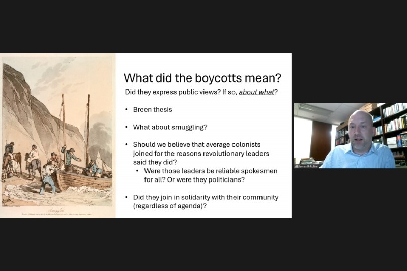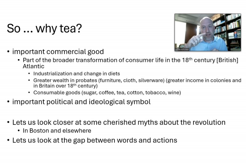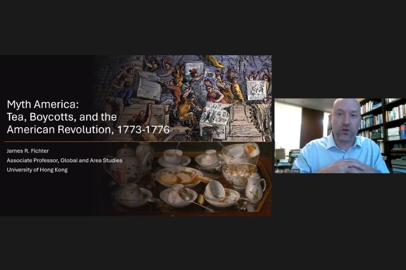 應中大比較及公眾歷史研究中心邀請,香港大學現代語言及文化學院的詹姆斯·費希特教授於2024年4月11日以「神話美國:茶葉、抵制和美國革命」為題進行講座。講者探討茶葉在1773至1776年間作為政治象徵和經濟商品的複雜角色,並強調抵制行動如何凸顯公共政治反抗和私人消費之間的緊張關係。講座揭示了雖然殖民地居民公開宣佈放棄購買徵稅的茶葉,但有證據顯示仍有大量茶葉經合法或走私途徑被購買。此外,費希特教授強調儘管殖民地居民表面上在波士頓傾茶等事件中團結一致,但他們之間仍然存在嚴重的內部分歧。為了表達他們對1773年《茶葉法案》和1774年《強制法案》的反對,銷毀茶葉成為一種象徵性行為,卻沒有徹底地執行。總之,講者將抵制茶葉定位為美國革命中一個關鍵卻矛盾的因素。它既有效激發集體行動,亦暴露了殖民抵抗運動的內部矛盾。